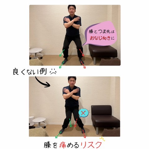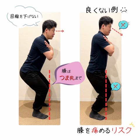 膝がつま先より前に出すぎないよう、お尻を後ろに引くイメージで行います。膝が痛い方は、椅子からの立ち座りを繰り返すだけでも、立派な太もものトレーニングになります。